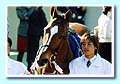写真をクリックすると、420×280(30kB前後)サイズの拡大版がご覧になれます。 第2回ジャパンカップダートが行われるこの日、昼休みに「砂の女傑」ファストフレンド号の引退式が行われました。6月26日大井の第24回帝王賞でのラストランから約5ヶ月ぶりでしたが、現役時とは見劣らぬ馬体。第23回帝王賞優勝時のゼッケンでパドックに登場しました。本馬場ではダートではなく、スタンドのお客さんにより近いターフを最後の疾走。ファストフレンドが芝を走るのはデビュー戦以来2度目のことです。 表彰式では、長岡一也氏、柏木集保氏も登場して蛯名騎手へのインタビューが行われるも、2階席から撮影していた私にはなんて言ってたのか殆ど聞こえず。「アメリカ遠征中にも呼び戻して乗せてもらって云々」という話をしていたらしいです。その後、馬主氏の挨拶の間に下に降りて見た。・・・が人垣で見えない・・・。なんとか隙間から撮影したのが【8】の写真。 牝馬ながらに7歳まで現役で頑張ったファストフレンド、初年度のお相手は、この日JCダートを圧勝したクロフネの父であるフレンチデピュティ。バリバリのダート馬を作るんだそうです。