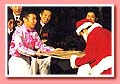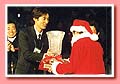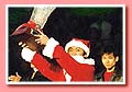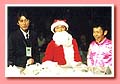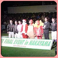 写真をクリックすると、420×280(30kB前後)サイズの拡大版がご覧になれます。 美浦トレセンのサンタ事件もあって、サンタ姿で入場した蛯名騎手はファンに大受け。CM撮影の時はいつも私達に見せる物静かな蛯名騎手だったんでしょうか、共演したナインティナインの矢部氏が「こんなことする人に見えなかった」と驚いてました。それに対し、蛯名騎手は「普段はこんなですよ。」。ホントですかぁ? いつもは、両手を前に行儀良く立っている蛯名騎手も、この時は寒かったのか両手を胴のわきでパタパタさせペンギンのような・・・。 蛯名騎手に負けず普段通りなのが、ビッグマック村田騎手と、フライドポテト後藤騎手。この2人はホントに全く普段通りです。本職のナインティナインのお2人がとても地味に見えてしまいました(笑)。ラストは蛯名騎手とマクドナルドブラザーズでパドックのファンに手を伸ばして2周ほど走って回ってました。写真は・・・私もフェンスに押しかけてしまい、撮影してません。 騎手会副会長の加藤和宏騎手から挨拶がありましたが、美浦のサンタに関して「副会長の立場上、本当は注意しなくちゃいけないんだけど、僕は叱れません!」と強く言い放つとても素晴らしいものでした。この挨拶で加藤騎手のファンも増えたのでは?来年も楽しいファンサービス、期待してます!